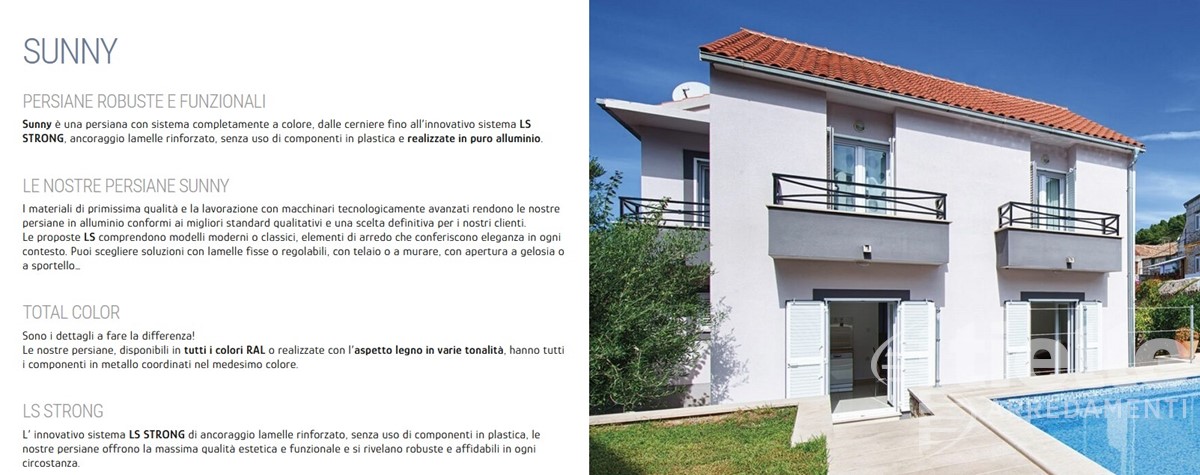 Sunny è una persiana con sistema completamente a colore, dalle cerniere fino all’innovativo sistema LS STRONG, ancoraggio lamelle rinforzato, senza uso di componenti in plastica e realizzate in puro alluminio.