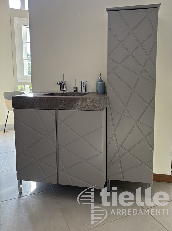 Realizzazione su misura di mobiletto da bagno con n. 2 ante + elemento colonna ad un' anta / struttura in mdf idrofugo con finitura laccata con ante mod. Incise geometriche.